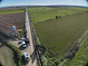 Vista aérea de la Jornada de Divulgación en campo, donde se aprecia los asistentes entorno a una compuerta en la parcela instala de Valtierra.