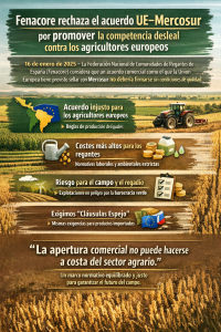 16 de enero de 2026 – La Federación Nacional de Comunidades de Regantes de España (Fenacore) considera que un acuerdo comercial como el que la Unión Europea tiene previsto sellar con Mercosur no debería firmarse sin asegurar previamente unas condiciones reales de igualdad para los agricultores europeos. Ante el viaje de la presidenta de la Comisión Europea, Ursula von der Leyen, a Asunción (Paraguay) para poner fin a 25 años de negociaciones frustradas y unir a los 27 estados miembros de la UE con Argentina, Brasil, Uruguay y Paraguay -abarcando a más de 740 millones de personas y creando la mayor zona de libre comercio del mundo-; Fenacore asegura que no puede hablarse de competencia justa si las normas que regulan la producción de alimentos no son las mismas para todos.
