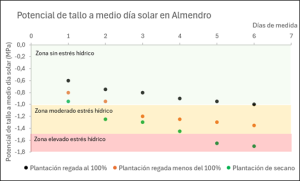 A modo de ejemplo, la figura 2 muestra las medidas de potencial de tallo a medio día solar en tres plantaciones de almendro: una de ellas regada al 100%; otra regada por debajo de las necesidades de riego máximas; y la tercera de ellas se trata de una plantación de secano. Se observa que los potenciales de la regada al 100% se encuentran en la zona sin estrés hídrico, en todas las medidas realizadas, representada en la gráfica en trama de color verde. En cambio, la plantación de secano, únicamente en la primera medida se encontraba sin estrés, posteriormente pasa a una zona de estrés moderado (segunda, tercera y cuarta medida), para finalmente encontrarse con elevado estrés hídrico (quinta y sexta medida). Niveles intermedios de potenciales son los que presenta la plantación que ha sido regada con el objetivo de alcanzar un estrés hídrico moderado. Por tanto, la decisión de cuándo aplicar el riego de manera objetiva, vendrá determinada por el cultivo y el valor de potencial encontrado, así como del nivel de estrés que nos hayamos marcado entre los objetivos de manejo productivos.